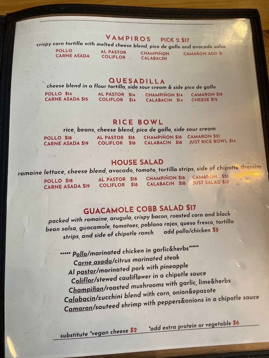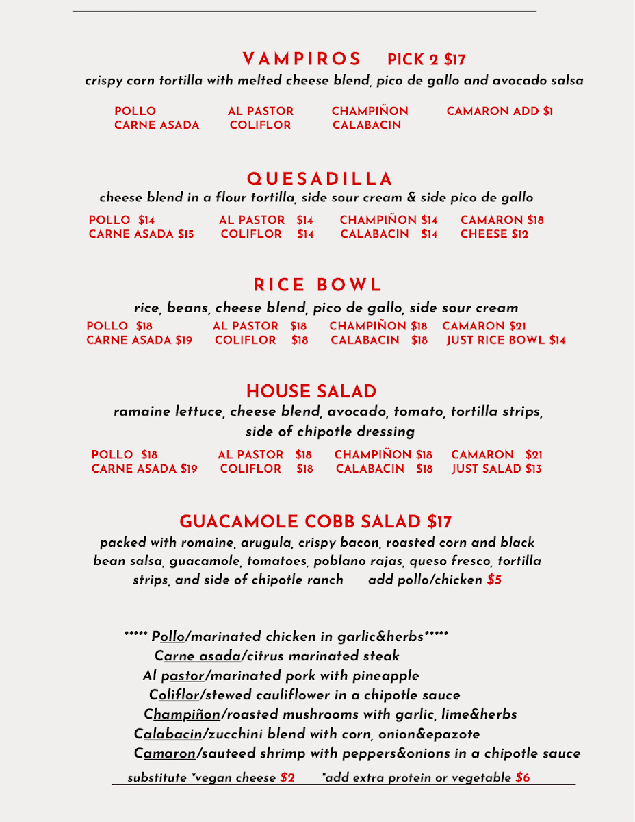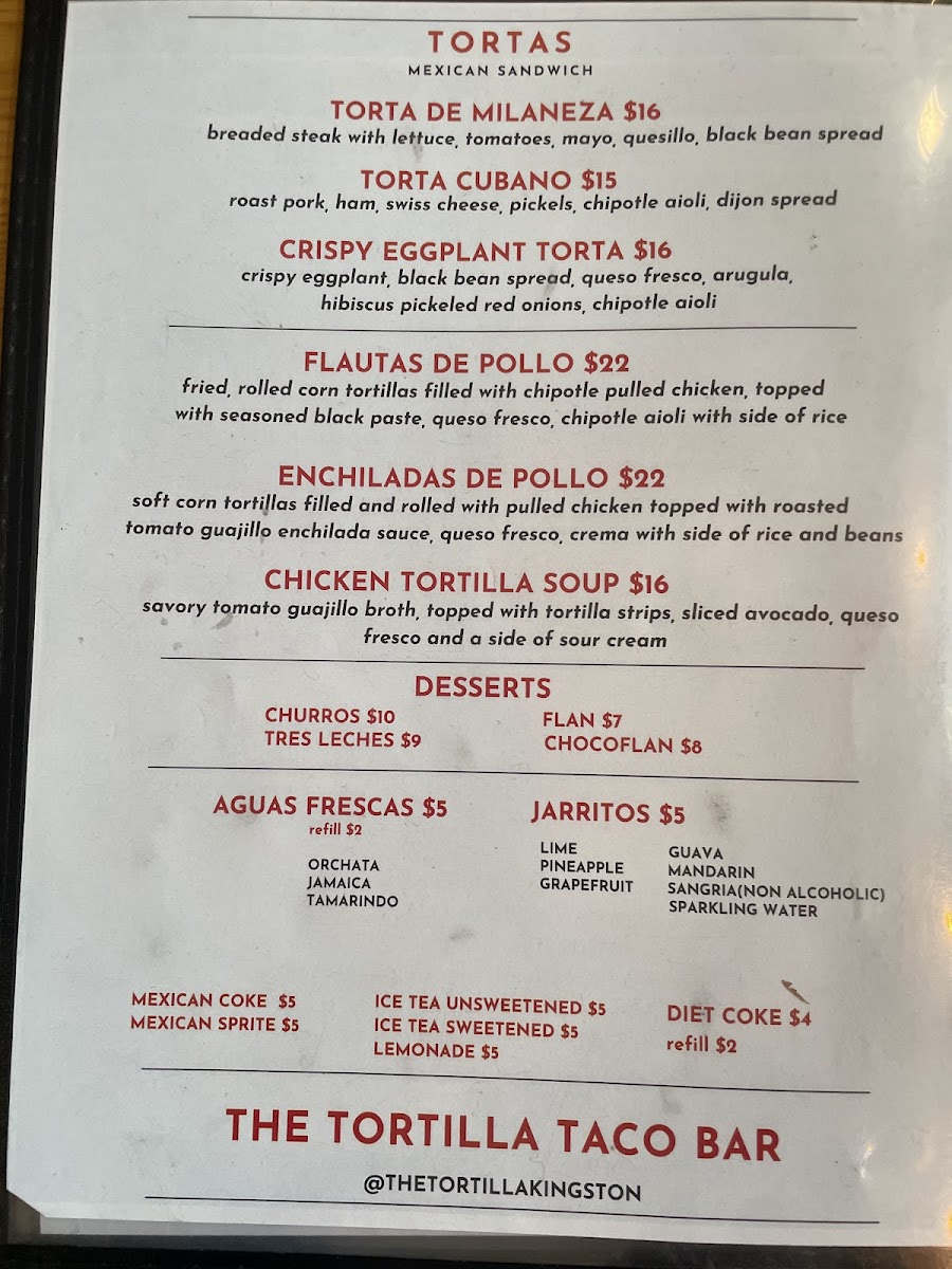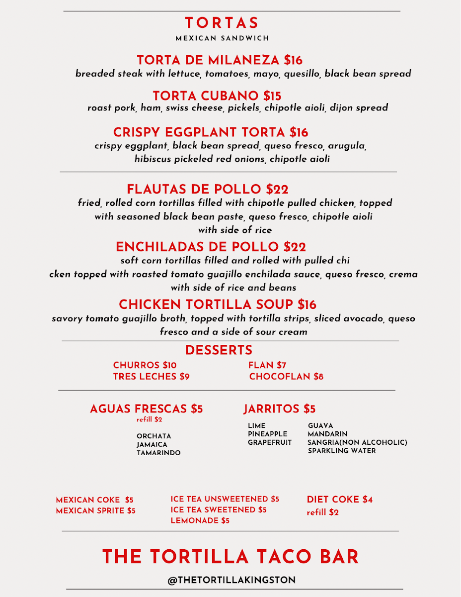 From a reviewer’s perspective, the menu at The Tortilla Taco Bar delivers a confident, well-rounded snapshot of Mexican street food with enough variety to satisfy both traditionalists and adventurous diners. It begins strong with approachable starters like CHIPS & SALSA, CHIPS & GUAC, ELOTE / ON COB RICE & BEANS, and CHIPS, GUAC & SALSA, setting a casual, shareable tone. The heart of the menu lies in its burritos, where options such as the CARNE ASADA BURRITO, CALIFORNIA BURRITO, RAJAS BURRITO, SURF & TURF BURRITO, and SHRIMP BURRITO showcase bold fillings and comforting portions. Tacos are clearly a highlight, with a flexible deal that invites exploration: PICK ANY 2 TACOS FOR $22 or ANY 3 FOR $27 WITH RICE AND BEANS, featuring standouts like BIRRIA QUESATACO, SHRIMP TACOS DORADO, ROAST PORK TACO, CHORIZO TACO, and MILANESA TACO. The menu continues to impress with crave-worthy VAMPIROS (PICK 2), a diverse quesadilla lineup including POLLO QUESADILLA, CARNE ASADA QUESADILLA, AL PASTOR QUESADILLA, COLIFLOR QUESADILLA, and CHAMPIÑON QUESADILLA, and hearty bowls such as the POLLO RICE BOWL, CARNE ASADA RICE BOWL, AL PASTOR RICE BOWL, COLIFLOR RICE BOWL, and CHAMPIÑON RICE BOWL. Lighter yet flavorful choices appear in the POLLO HOUSE SALAD, CARNE ASADA HOUSE SALAD, AL PASTOR HOUSE SALAD, COLIFLOR HOUSE SALAD, CHAMPIÑON HOUSE SALAD, and the indulgent GUACAMOLE COBB SALAD. Tortas and classic plates like TORTA DE MILANEZA, TORTA CUBANO, CRISPY EGGPLANT TORTA, FLAUTAS DE POLLO, and ENCHILADAS DE POLLO round out the savory side before desserts such as CHURROS, TRES LECHES, FLAN, and CHOCOFLAN provide a sweet finish. Paired with refreshing drinks like AGUAS FRESCAS, JARRITOS, MEXICAN COKE, MEXICAN SPRITE, ICE TEA UNSWEETENED, ICE TEA SWEETENED, LEMONADE, and DIET COKE, the menu feels complete, thoughtful, and true to its vibrant Mexican inspiration-making it a satisfying conclusion to the overall dining experience.