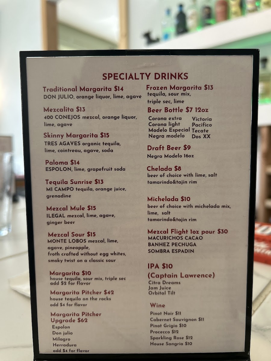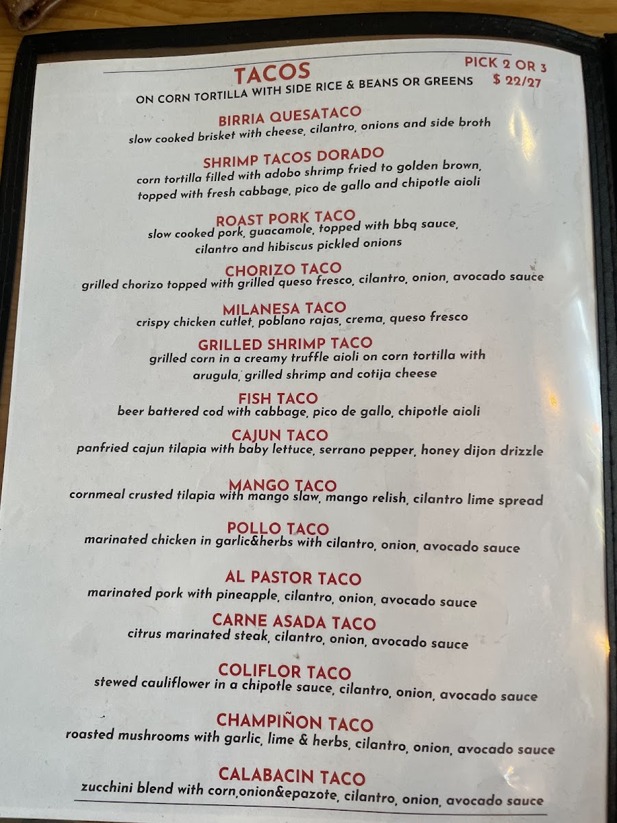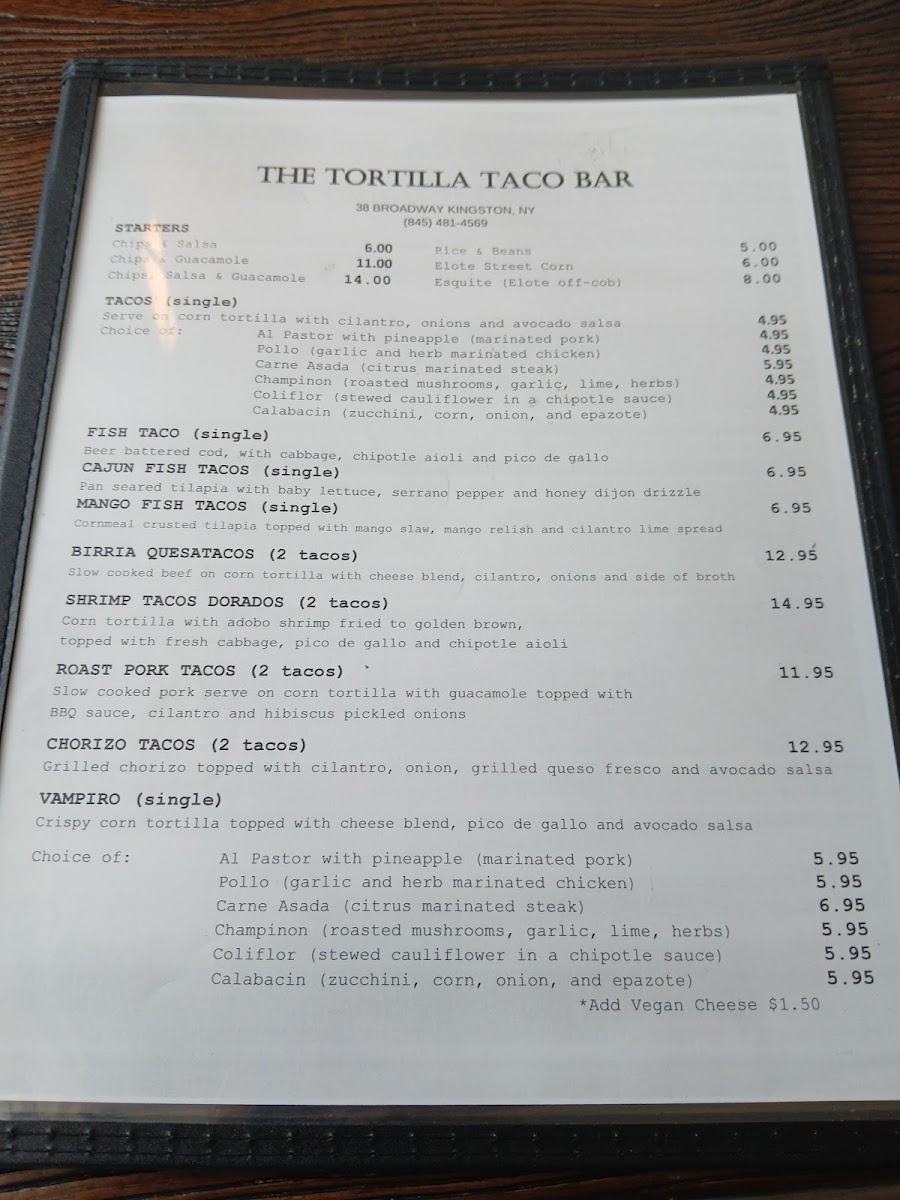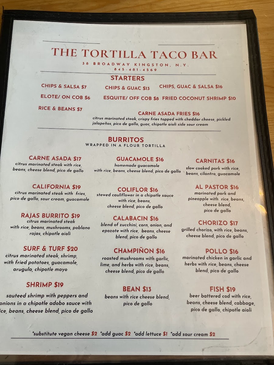 From a reviewer’s perspective, the menu at The Tortilla Taco Bar delivers a confident, well-rounded snapshot of Mexican street food with enough variety to satisfy both traditionalists and adventurous diners. It begins strong with approachable starters like CHIPS & SALSA, CHIPS & GUAC, ELOTE / ON COB RICE & BEANS, and CHIPS, GUAC & SALSA, setting a casual, shareable tone. The heart of the menu lies in its burritos, where options such as the CARNE ASADA BURRITO, CALIFORNIA BURRITO, RAJAS BURRITO, SURF & TURF BURRITO, and SHRIMP BURRITO showcase bold fillings and comforting portions. Tacos are clearly a highlight, with a flexible deal that invites exploration: PICK ANY 2 TACOS FOR $22 or ANY 3 FOR $27 WITH RICE AND BEANS, featuring standouts like BIRRIA QUESATACO, SHRIMP TACOS DORADO, ROAST PORK TACO, CHORIZO TACO, and MILANESA TACO. The menu continues to impress with crave-worthy VAMPIROS (PICK 2), a diverse quesadilla lineup including POLLO QUESADILLA, CARNE ASADA QUESADILLA, AL PASTOR QUESADILLA, COLIFLOR QUESADILLA, and CHAMPIÑON QUESADILLA, and hearty bowls such as the POLLO RICE BOWL, CARNE ASADA RICE BOWL, AL PASTOR RICE BOWL, COLIFLOR RICE BOWL, and CHAMPIÑON RICE BOWL. Lighter yet flavorful choices appear in the POLLO HOUSE SALAD, CARNE ASADA HOUSE SALAD, AL PASTOR HOUSE SALAD, COLIFLOR HOUSE SALAD, CHAMPIÑON HOUSE SALAD, and the indulgent GUACAMOLE COBB SALAD. Tortas and classic plates like TORTA DE MILANEZA, TORTA CUBANO, CRISPY EGGPLANT TORTA, FLAUTAS DE POLLO, and ENCHILADAS DE POLLO round out the savory side before desserts such as CHURROS, TRES LECHES, FLAN, and CHOCOFLAN provide a sweet finish. Paired with refreshing drinks like AGUAS FRESCAS, JARRITOS, MEXICAN COKE, MEXICAN SPRITE, ICE TEA UNSWEETENED, ICE TEA SWEETENED, LEMONADE, and DIET COKE, the menu feels complete, thoughtful, and true to its vibrant Mexican inspiration-making it a satisfying conclusion to the overall dining experience.